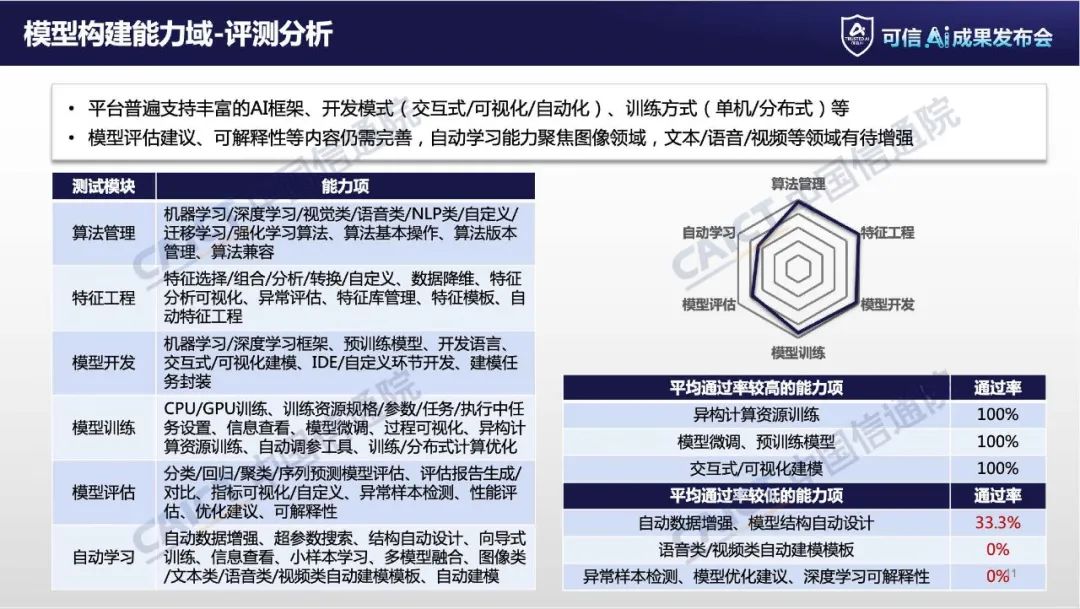 模型构建能力域方面,算法管理、特征工程、模型开发、模型训练通过率较高,模型评估和自动学习通过率较低。平台普遍配置丰富的框架及算法,提供交互式、可视化和自动化多种开发模式,并支持单机/分布式多种训练方式。模型评估建议和模型可解释性等能力有待提高,面向文本、语音和视频场景的自动学习建模模版的支持能力还需加强。