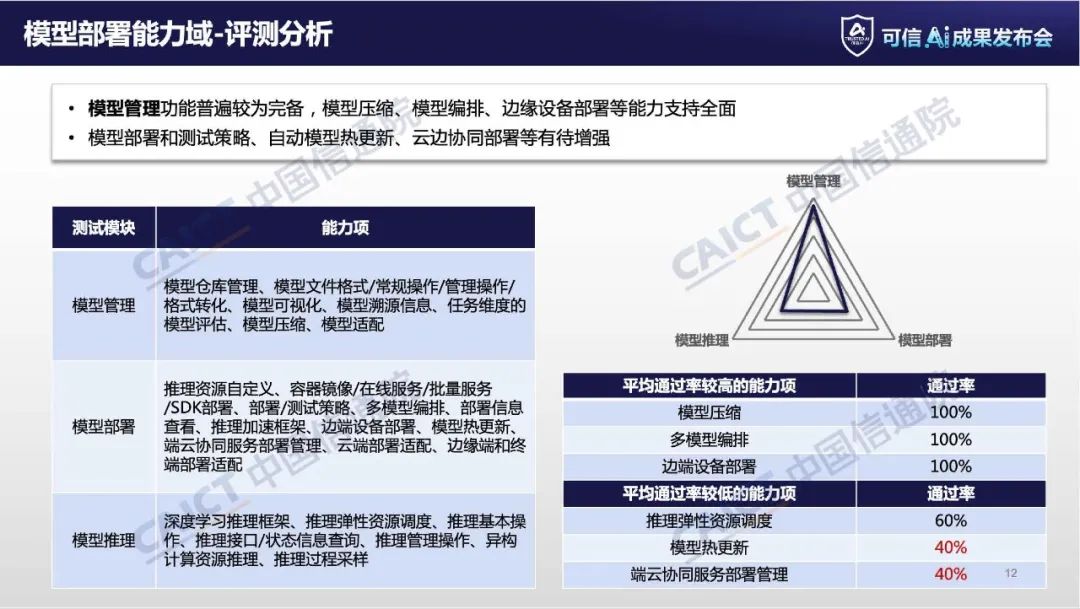 模型部署能力域方面,模型管理通过率较高,模型部署和模型推理通过率较低。平台对模型压缩、模型编排以及边缘设备的模型部署能力支持较为全面。基于规则的模型自动更新能力和模型在端云设备协同部署的能力有待进一步提升。