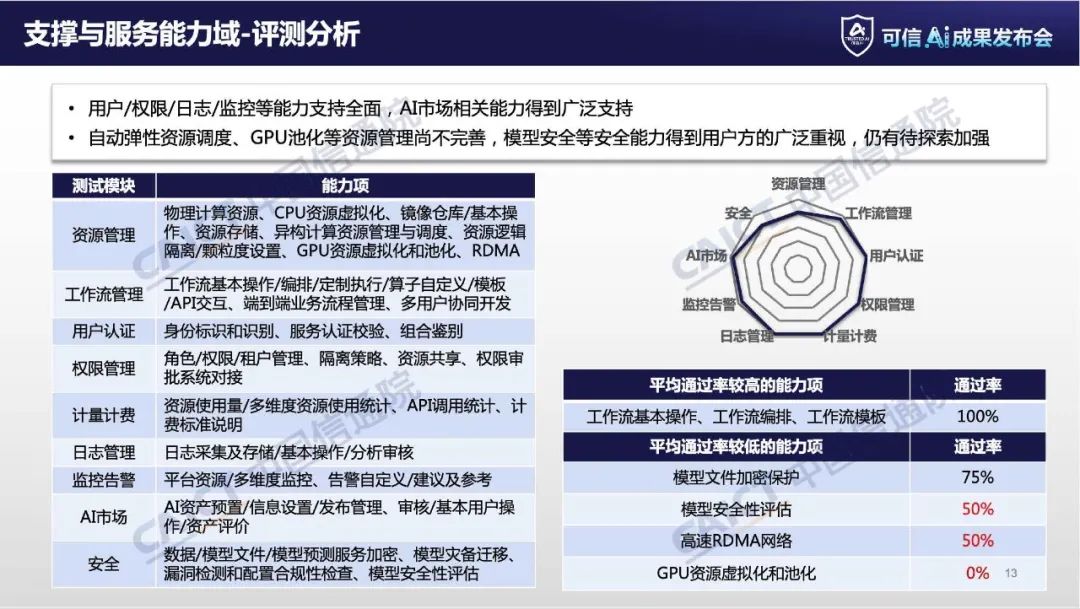 支撑与服务能力域方面,用户认证、权限管理、计量计费、日志管理、监控告警和AI市场通过率较高,资源管理和安全通过率较低。权限、日志等信息化支撑能力较为完备,工作流相关基础功能正逐步完善。GPU的虚拟化和池化、数据和模型的安全仍是产业痛点。