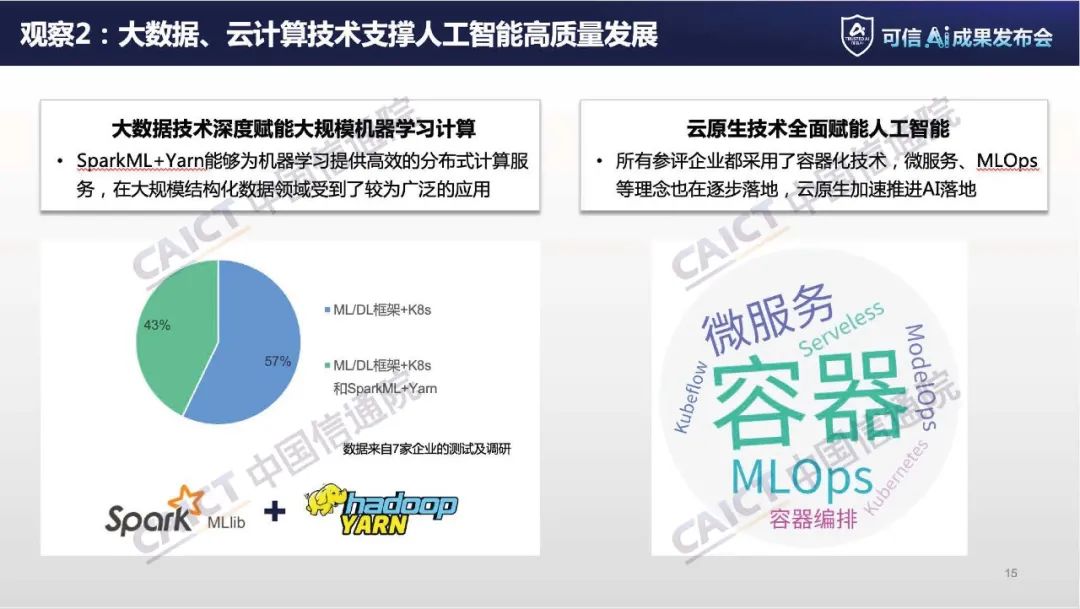 大数据技术和云原生不断赋能人工智能开发平台,云数智融合趋势将加速AI应用落地。大数据方面,近半数的平台使用SparkML、Yarn等技术为用户提供大规模机器学习任务的分布式计算,为基于结构化数据的智能决策持续赋能。云原生方面,容器化技术已经成为产业届的事实标准并得到了广泛应用,云原生与人工智能的融合也催生出MLOps、KubeFlow等理念和工具。