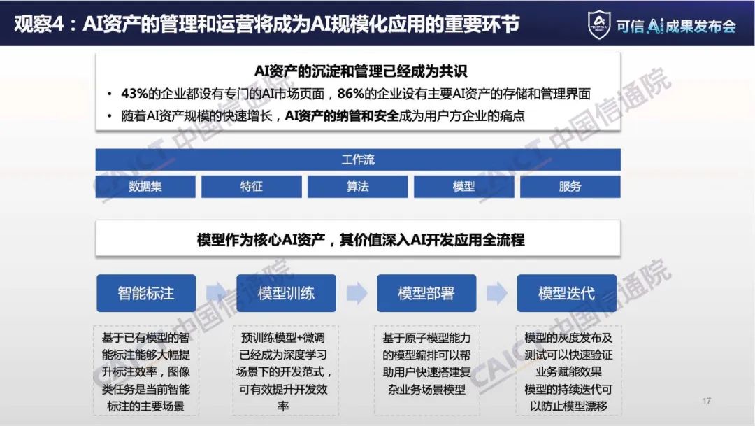 AI资产的沉淀和管理成为产业共识,但AI资产的纳管机制和安全体系有待完善。多数企业配备了AI市场对数据、特征、算法、模型、服务、工作流等AI资产进行沉淀和管理。模型作为核心AI资产在开发流程的各环节均有应用,如在数据处理环节使用预训练模型进行智能标注,在模型训练环节使用预训练模型加微调进行模型开发,在模型部署环节使用原子模型编排进行复杂场景的模型部署。虽然AI资产的纳管和安全已经受到了关注,但是完善的纳管机制和安全体系仍是产业界需要努力的方向。