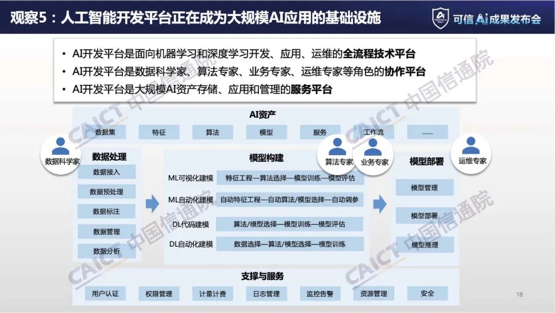人工智能开发平台正在成为大规模AI应用的基础设施。人工智能开发平台提供机器学习和深度学习开发、应用和运维的能力,衔接起数据科学家、算法专家、业务专家和运维专家等各类角色的协作,提供AI资产存储、应用和管理的服务。人工智能开发平台可以帮助企业将AI生产从小作坊的手工模式转化为大规模的流水线模式,推动AI应用的规模化落地。
