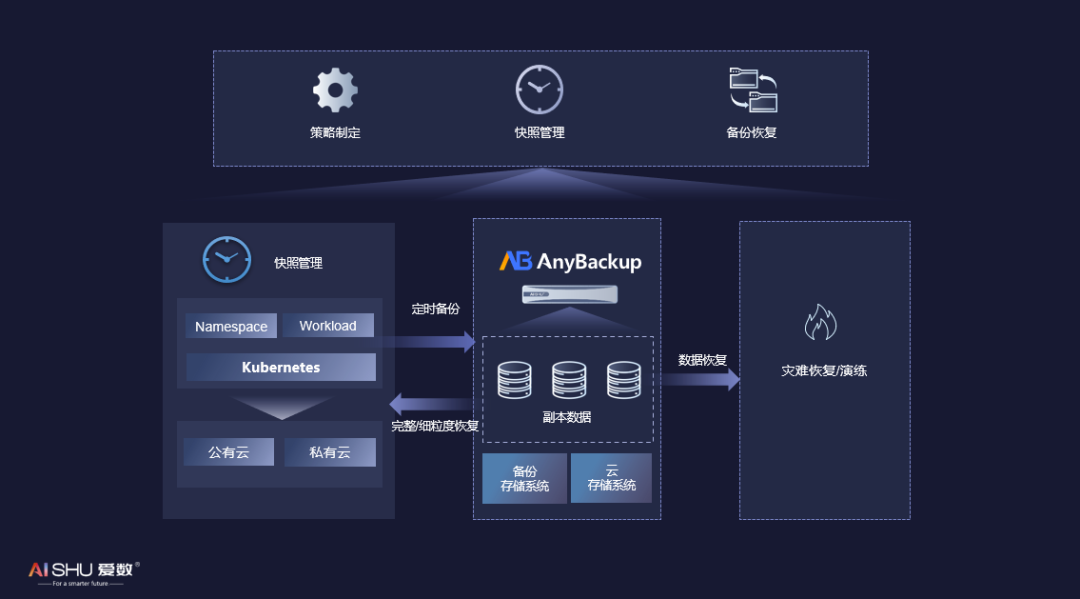 AnyBackup Kubernetes 数据保护能够广泛兼容私有云、公有云 Kubernetes 的部署场景,CSI、非 CSI 的生产存储使用场景,统一保护 Kubernetes 与其他应用,并提供集群、Namespace 及Workload 三种备份恢复粒度,实现全面灵活的数据保护。