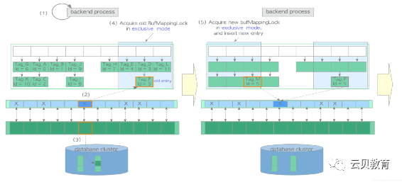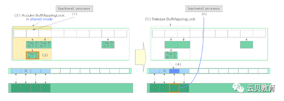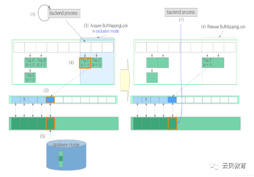(1)查找缓冲区表(本节假设页面不存在,找不到对应页面)。创建所需页面的 buffer_tag(本例中 buffer_tag 为 ‘Tag_E’ )并计算其散列桶槽。以共享模式获取相应分区上的 BufMappingLock。查找缓冲区表(根据假设,这里没找到)。释放 BufMappingLock。(2)从 freelist 中获取空缓冲区描述符,并将其钉住。在本例中所获的描述符:buffer_id=4。(3)以独占模式获取相应分区的 BufMappingLock(此锁将在步骤(6)中被释放)。(4)创建一条新的缓冲表数据项:buffer_tag=‘Tag_E’, buffer_id=4,并将其插入缓冲区表中。(5)将页面数据从存储加载至 buffer_id=4 的缓冲池槽中,如下所示:以排他模式获取相应描述符的 io_in_progress_lock。将相应描述符的 IO_IN_PROGRESS 标记位设置为1,以防其他进程访问。将所需的页面数据从存储加载到缓冲池插槽中。更改相应描述符的状态,将 IO_IN_PROGRESS 标记位设置为"0",且 VALID 标记位设置为"1"。释放 io_in_progress_lock。(6)释放相应分区的 BufMappingLock。(7)访问 buffer_id=4 的缓冲池槽。