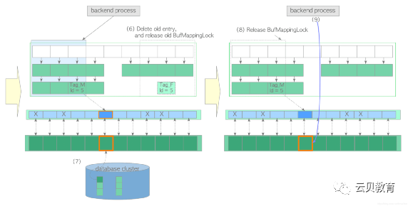 (1)创建所需页面的 buffer_tag 并查找缓冲表。在本例中假设 buffer_tag 是 ‘Tag_M’ (且相应的页面在缓冲区中找不到)。(2)使用时钟扫描算法选择一个受害者缓冲池槽位,从缓冲表中获取包含着受害者槽位 buffer_id 的旧表项,并在缓冲区描述符层将受害者槽位的缓冲区描述符钉住。本例中受害者槽的 buffer_id=5,旧表项为 Tag_F, id = 5。(3)如果受害者页面是脏页,则将其刷盘(write & fsync),否则进入步骤(4)。在使用新数据覆盖脏页之前,必须将脏页写入存储中。脏页的刷盘步骤如下:1. 获取 buffer_id=5 描述符上的共享 content_lock 和独占 io_in_progress_lock。2. 更改相应描述符的状态:相应 IO_IN_PROCESS 位设置为"1",JUST_DIRTIED 位设置为"0"。3. 根据具体情况,调用 XLogFlush() 函数将WAL缓冲区上的WAL数据写入当前WAL段文件。4. 将受害者页面的数据刷盘至存储中。5. 更改相应描述符的状态;将 IO_IN_PROCESS 位设置为"0",将 VALID 位设置为"1"。6. 释放 io_in_progress_lock和 content_lock。以排他模式获取缓冲区表中旧表项所在分区上的 BufMappingLock。(5)获取新表项所在分区上的 BufMappingLock,并将新表项插入缓冲表:创建新表项:由 buffer_tag='Tag_M’与受害者的 buffer_id组成的新表项。以独占模式获取新表项所在分区上的 BufMappingLock。将新表项插入缓冲区表中。(6)从缓冲表中删除旧表项,并释放旧表项所在分区的 BufMappingLock。(7)将目标页面数据从存储加载至受害者槽位,然后用 buffer_id=5 更新描述符的标识字段,将脏位设置为0,并按流程初始化其他标记位。(8)释放新表项所在分区上的 BufMappingLock。(9)访问 buffer_id=5 对应的缓冲区槽位。