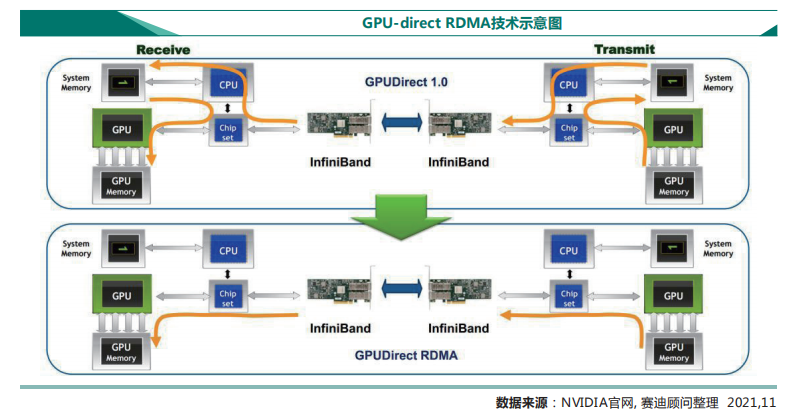 GPU-Direct RDMA技术使得进一步减少了GPU通信的数据复制次数,通信延迟进一步降低。Mellanox网卡已经提供了GPUDirect RDMA的支持(既支持InfiniBand传输,也支持RoCE传输),在英伟达收购Mellanox后,英伟达的所有网卡已全面支持GPU-Direct RDMA技术。