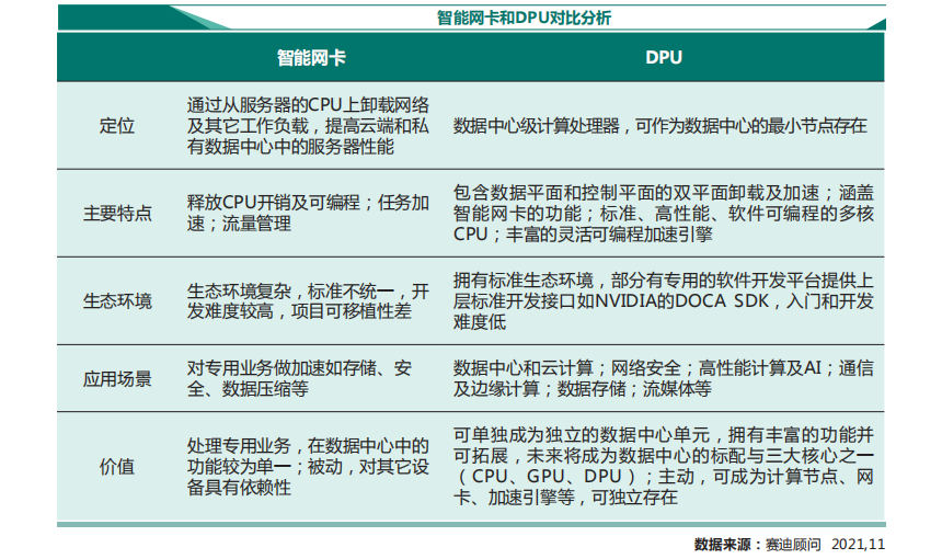 智能网卡中包括FPGA型和ARM核心型,FPGA型难以处理控制平面任务;ARM型则会因处理其它任务而负载过重,DPU包含数据平面和控制平面的双平面卸载及加速,可以解决以上问题。另外DPU与智能网卡的最大区别是可作为数据中心的最小节点存在,拥有计算功能、网卡功能、加速计算引擎、安全引擎等并可拓展,未来将成为数据中心的标配与三大核心之一(CPU、GPU、DPU)。