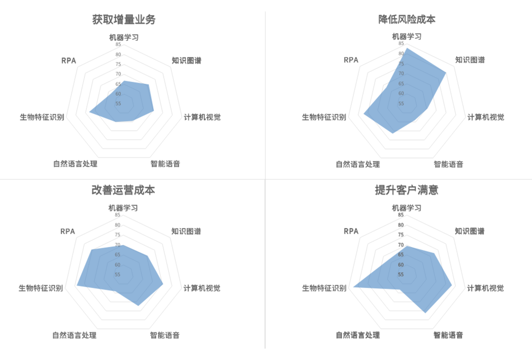 人工智能技术赋能主要聚焦金融业务链上五大环节的需求,在获取增量业务、降低风险成本、改善运营成本,提升客户满意度四类金融业务场景方面价值创造力突出。
