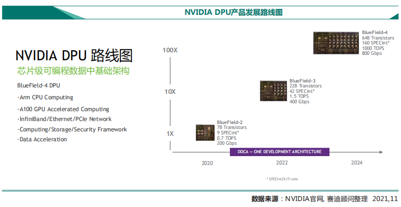 NVIDIA的BlueField DPU产品发展路线图如图所示,包括了已有的二代产品BlueField-2,目前即将面世的首款达400Gb/s速度的BlueField-3 DPU,以及未来整合了NVIDIA GPU功能,可达800Gb/s的BlueField-4 DPU。