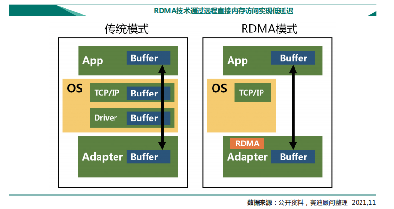 RDMA技术,可直接在内存之间交换数据,并获得较好的扩展性,提升运行性能,且可卸载CPU算力。RDMA优势如下包括: