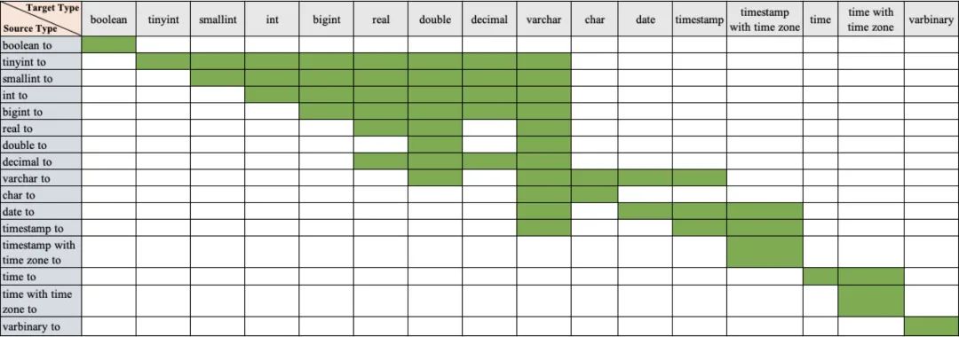 天穹 Presto 隐式转换规则表如下所示:(绿色表示支持从 Source Type 到 Target Type 的隐式转换,其余空白格表示不支持类型之间的隐式转换)。