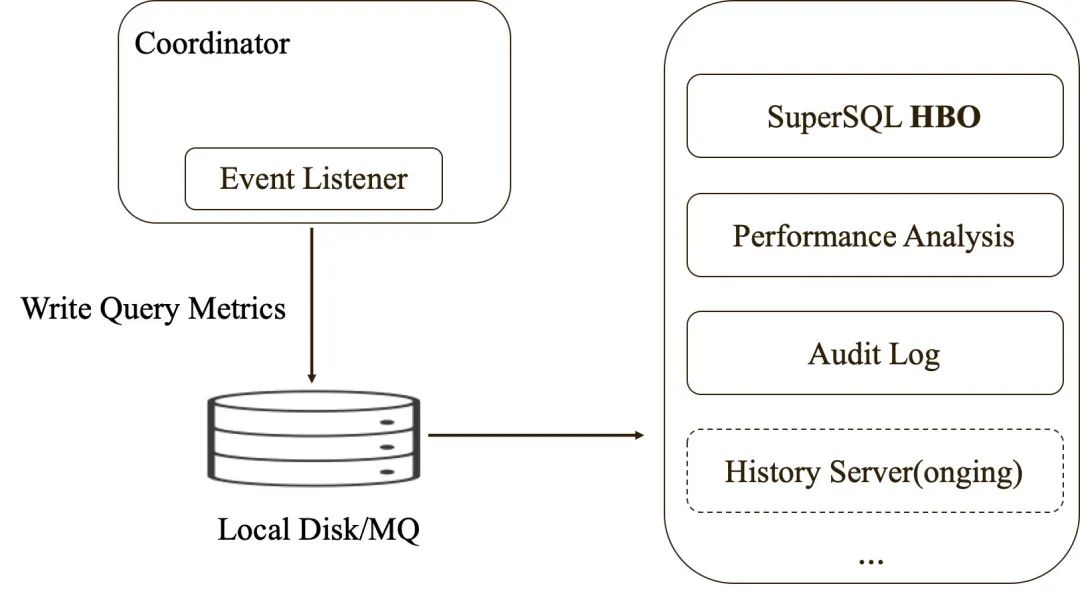 Presto 的 Event Listener 提供了相关的接口,可以在查询执行完成后获取不同纬度的 Metrics 信息,比如查询执行期间各阶段的耗时、处理的数据量、内存/CPU 消耗、Stage/Task/Operator 统计信息等,天穹 Presto 扩展实现了 Event Listener 接口,将这些 Query Metrics 信息持久化到本地磁盘以及消息组件中,用于后续的问题定位、运维审计、资源统计、HBO 等。
