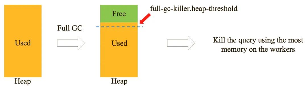 Presto 的查询内存使用统计是相对比较粗粒度的,这可能会导致原生的 LowMemoryKillerPolicy 在某些情况下不能正确地 Kill 查询,天穹 Presto 在线上运行的过程中就遇到过类似的情况:Worker 堆内存已经接近用满了,但是 Presto 自身的 Memory Pools 显示还有较多的空闲内存,导致无法及时触发 LowMemoryKillerPolicy。为了尽量避免这种情况,天穹 Presto 开发了 Full GC Query Killer,该策略可以在 Worker Full GC 之后,如果 Worker 堆内存使用还是处于高值,则 Kill 掉在该 Worker 上使用最多内存的查询。需要注意的是,该策略是在应用程序层面执行的,如果 Worker 不断地 Full GC 乃至最后 OOM,那么 Full GC Query Killer 可能也得不到响应,这时候还是需要通过其他手段分析定位出 Full GC 或 OOM 的原因,以彻底解决问题。