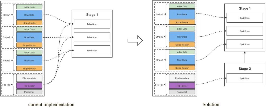 SplitFilerOperator 会先读取一次 ORC 文件的 Stripe 统计信息,生成新的 ORC Splits,新的 Splits 包含了利用 Stripe 统计信息过滤优化后的数据读取地址,后续 ORC Splits 分发至 Worker 中执行时,无需再读取 Stripe 统计信息,直接读取数据即可。