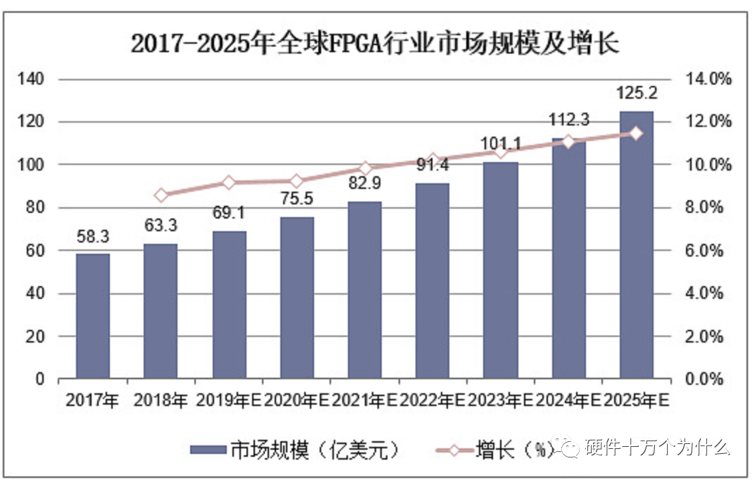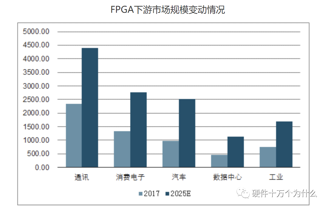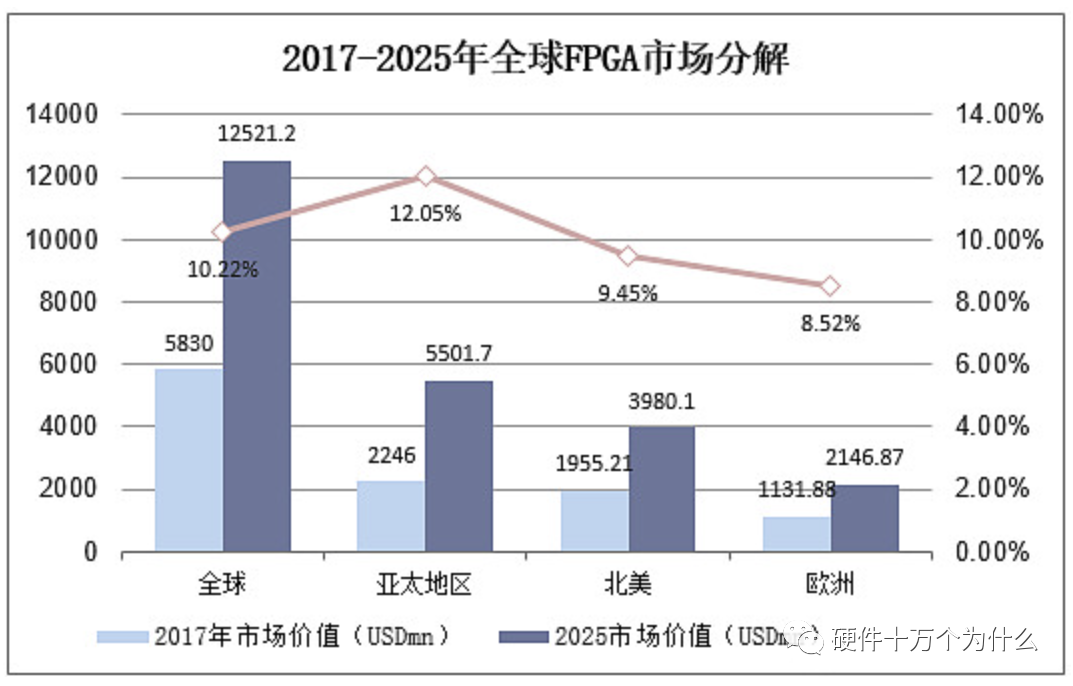 根据统计以及预测,在2013年全球FPGA的市场规模在45.63亿美元,至2018年全球FPGA的市场规模缓步增长至63.35亿美元。但随着目前5G时代的进展以及AI的推进速度,预计FPGA在2025年有望达到约125.21亿美元。2017年中国FPGA市场规模已达到100亿元,得益于AI、5G、云计算等新兴市场的兴起与发展,预计未来10年FPGA市场规模将会持续快速增长。预计到2022年,中国市场规模将超过300亿元,2017-2020六年间年复合增长率超25%对于全球FPGA的市场分布而言,FPGA的下游应用地区分布而言,目前最大的为亚太地区,占比39.15%,北美占比33.94%,欧洲占比19.42%;而至2025年,亚太地区的占比将会继续的提高至43.94%,此间原因也主要因为下游应用市场在未来的主要增长大部分集中在亚太地区。按照FPGA下游应用来分拆FPGA的市场规模的话,可以看到在2018年而言,通讯领域所用FPGA占据约40%,消费电子占据23%,为最大的应用下游;根据预测至2025年时最大的应用领域将是汽车,占比29%,而数据中心以及工业的占比也将直线上升至13%和19%。