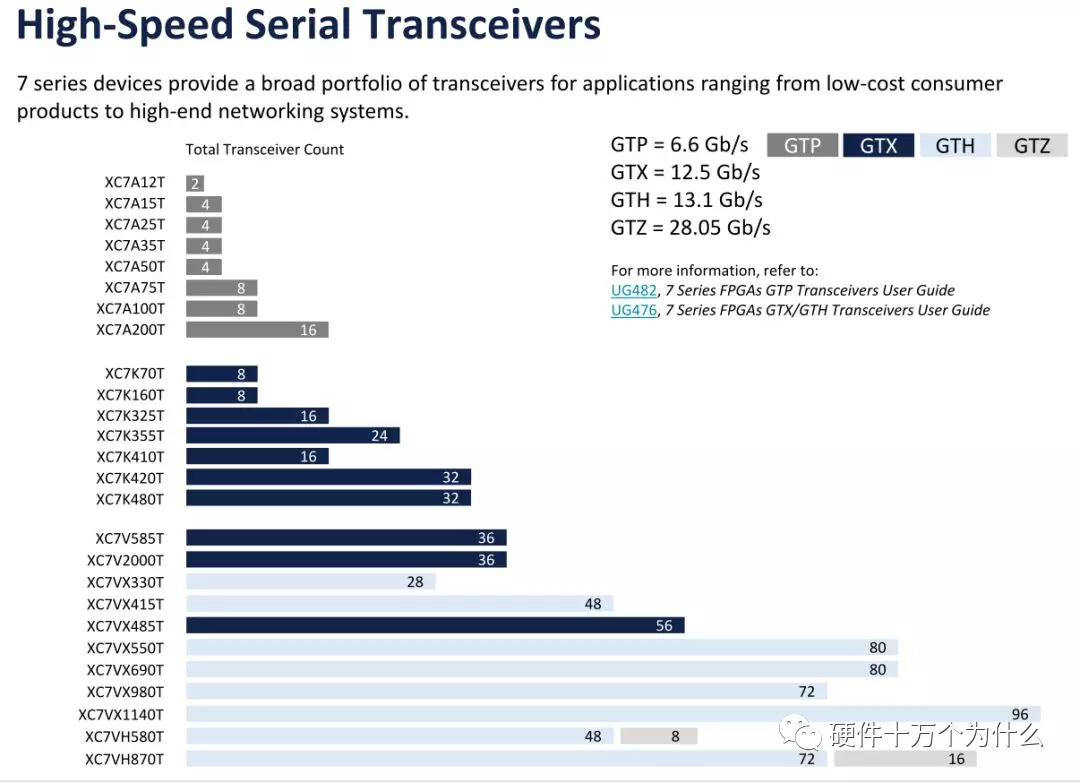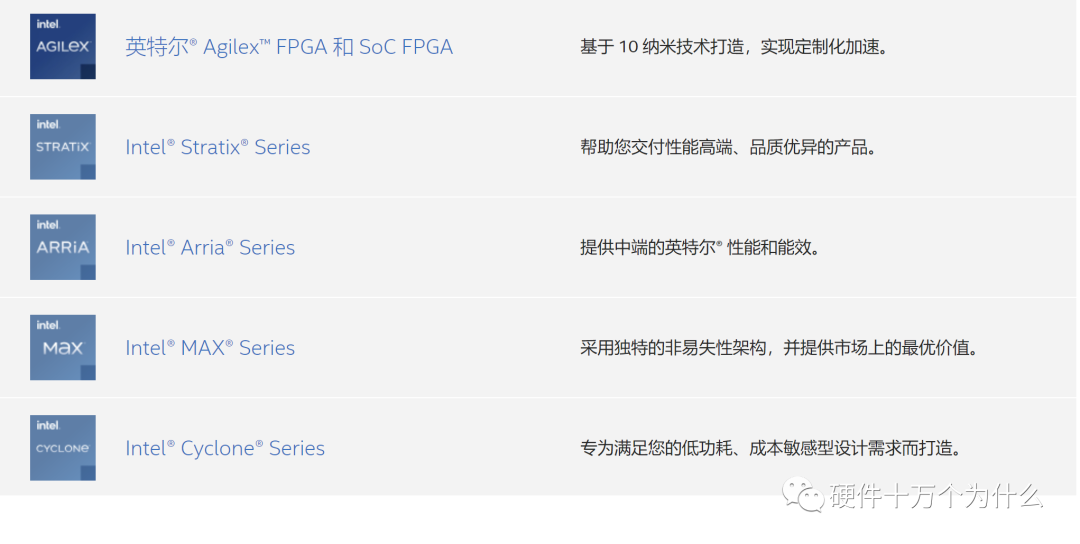 Xilinx与英特尔(Altera)拥有FPGA相关专利达6000多项,这么多的技术专利构成了很高的技术壁垒。目前FPGA的主要产业链供应商仍然集中在欧美地区。介绍:Xilinx是全球领先的可编程逻辑完整解决方案的供应商,也是目前排名第一的FPGA解决方案提供商。开发工具:Vivado,ISE(出了vivado之后,xilinx已经不考虑去升级ISE的版本了)Xilinx发布了他的下一个平台Vitis,也就是硬件和软件分开了(即Vivado和IDE分开了),除了启动方式和使用方法略有区别外,其他操作几乎与上一代Vivado一模一样。1、Spartan系列:定位于低端市场,目前最新器件为Spartan7,为28nm工艺,Spartan6以前都是45nm工艺,该系列器件价格实惠,逻辑规模相对较小。Spartan7系列是7系列中拥有最低的价格、最低的功耗、最小的尺寸以及最低的设计难度,一些低端应用中极为合适。2、Artix系列:Xilinx推出Artix系列产品,其目的应该是作为低端Spartan和高端Kintex的过渡产品,尤其在通信接口方面,相比Spartan有很大优势,所以,如果设计不是仅仅需要逻辑资源,而是需要先进的高速接口,不妨考虑Aritix系列。Artix7系列是7系列中,相对Spartan7系列则增加了串行收发器等高级硬核模块,其逻辑容量也更大,适合逻辑一些稍微复杂的中低端应用。3、Kintex和Virtex系列为Xilinx的高端产品,包含有28nm的Kintex7和Virtex7系列,还有16nm的Kintex7 Ultrascale+ 和Virtex7 Ultrascale+系列。丰富的高速接口,主要用于通信,雷达,信号处理,IC验证等高端领域。Kintex7系列是7系列中,在所有系列中拥有最佳的性价比,无论是硬核数量还是逻辑容量,都能满足中低端、以及部分高端应用需求。Virtex7系列则是7系列中的大佬,只在高端应用中使用4、全可编程 SoC 和 MPSoC系列,包括有Zynq-7000 和Zynq UltraScale+ MPSoC系列FPGA,可嵌入ARM Cortex系列CPU,逐渐成为目前SOPC热门应用。上图为Spartan7 子系列所有FPGA的所有逻辑资源列表上图为Artix7子系列所有FPGA的所有逻辑资源列表,可以看到该系列相比于spartan7除了逻辑资源增加以外,还多了GTP和PCIe的硬核,这样功能更丰富了。上图为Kintex7 子系列所有FPGA的所有逻辑资源列表,该系列相比于Artix7来说,逻辑资源更多了,并且不再支持GTP,而是支持性能更高的GTX串行收发器,并且其他硬核模块也更多了,比如CMT、Block RAM等。上图为Virtex7 子系列所有FPGA的所有逻辑资源列表,不用多说,无论是逻辑资源还是专用硬核资源更多了,属于该系列最高端的FPGA。上图为所有7系列FPGA的Block RAM资源柱状图上图为所有7系列FPGA的高速串行收发器资源柱状图,性能从低到高分别为GTP、GTX、GTH、GTZ,分别对应不同系列的FPGA。官网: http://www.altera.com介绍:业界与Xilinx齐名的FPGA供应商,于2015年被Intel以167亿美元收购。目前称作Intel FPGA,Altera化身为英特尔可编程事业部(PSG)。目前,Intel FPGA主要分为Agilex™、STRATIX、ARRIA、CYCLONE、MAX五大系列。