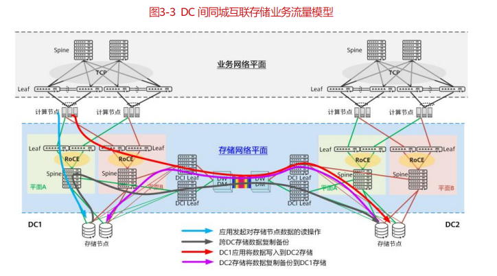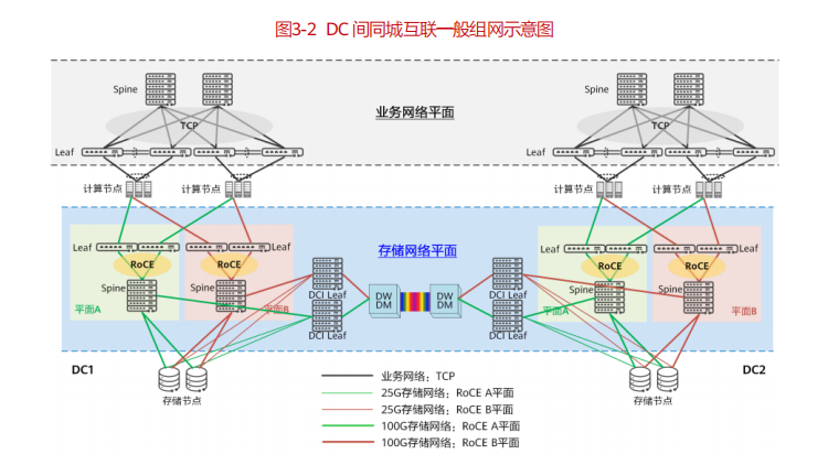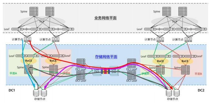 在集中式存储下,为了实现同城读写支持 NVME over ROCE,需要实现同城无损网络,即需要一套跨 DC 的无损网络,每个 DC 部署两台支持智能长距无损的 DCI Leaf,中间通过波分设备或者裸光纤直连实现双平面,实现端到端的 ROCE 无损网络。