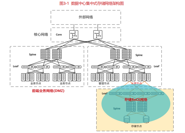 在数据中心常规组网里面,存储网络只是其中的一部分,集中式存储是一个独立的网络,与业务网络在物理上隔离。