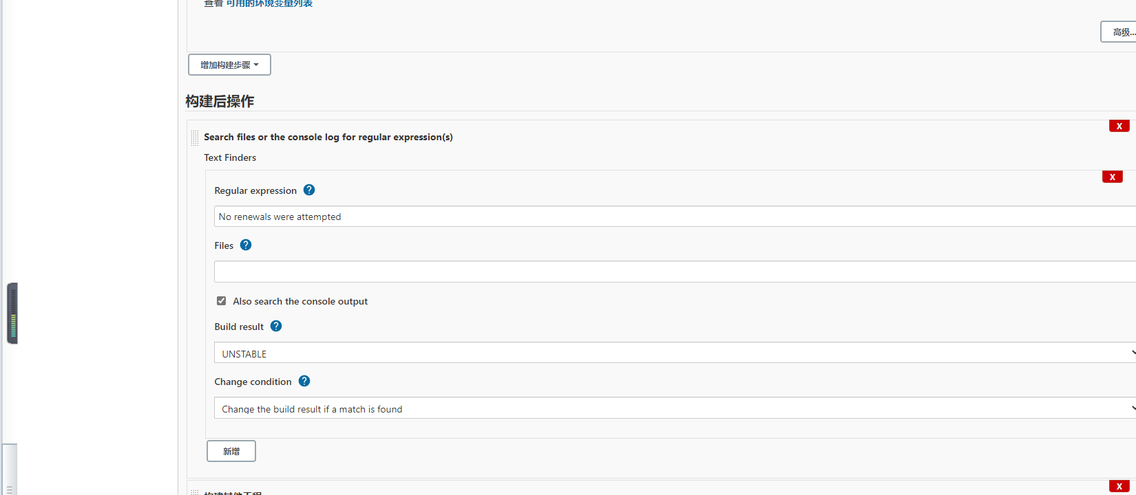 在构建厚操作里面选择search files or the console log for regular expression(s)