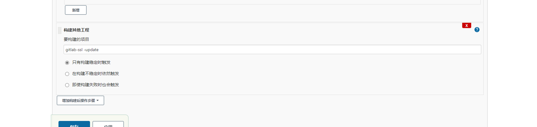 当上面选择的是success时是构建稳定时的触发,当选择unstable为不稳定构建,这样你可以判断是否执行其他job;