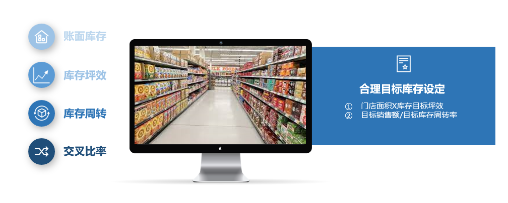 我们拿连锁超市来举例:前文提到为了保证门店的库存能更好的满足消费者的购买以及企业的收入,我们在做库存合理性分析时,就有一个非常重要的参考指标:“合理库存“,这个指标是根据门店的面积,坪效,目标销售额,目标库存周转率等指标综合得出。有了“合理库存”这个衡量指标后,我们将终端的“现有库存”与之进行对比,便可得出初步的问题判断,然后再做进一步数据拆解来分析具体的原因: