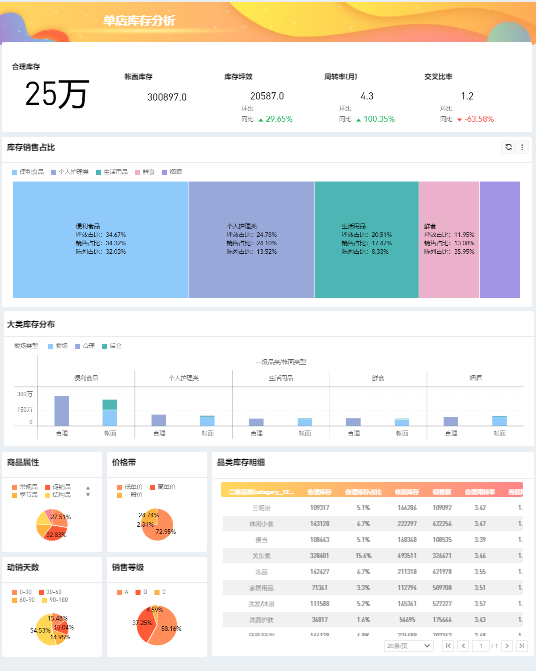 我们通过合理库存与现有对比,库存与销售的投入占比、大类库存分布、商品属性、价格带、动销天数等关键指标一步步的从全店拆解至单品。