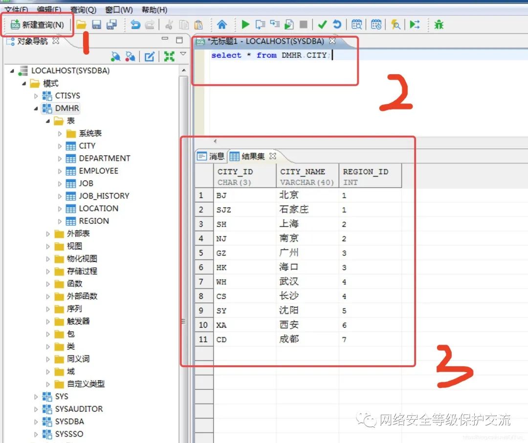 的SQL语句编写查询窗口,键入SELECT * FROM DMHR.CITY;