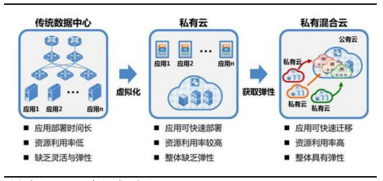 公有云架构:灵活的资源配置是公有云的核心,IT 环境的外包让一般性企业减少了资本支出并降低的运营 IT 的成本。当云计算概念被提出时,主要是指公有云服务,客户不需要保有任何基础设施,直接像水电煤一样使用云计算资源就可以,这些资源位于云提供商的数据中心,并由通过互联网访问它们的多个客户共享。但是商业的现实和技术企业的理想之间总是存在沟壑。在云计算服务开启之前,很多大型企业和组织都有自己的服务器。这些服务器大多数都卖给了企业和政府。但政府、金融、医药等行业客户,公有云不可能地全部采纳,因为这类型企业有各种各样的合规要求。