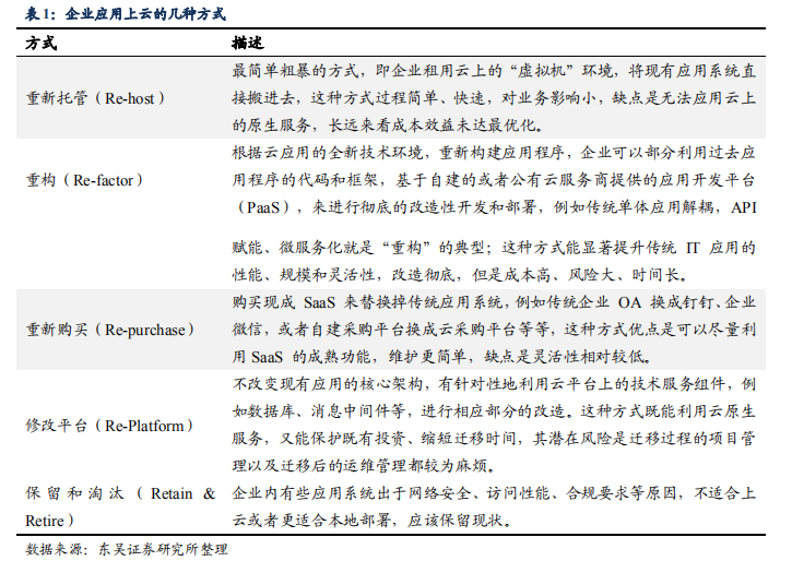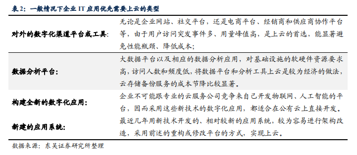 现有本地的应用采用上述何种方式上云,跟企业业务战略和数字化转型战略相匹配。企业上云,究竟是定位到什么样的深度,必须根据自身业务特性、业务战略以及行业趋势,找准定位。根据经验以下四种类型的企业 IT 应用通常作为上云的优先候选: