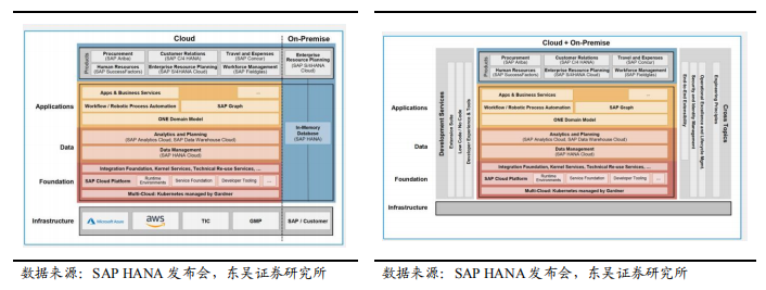SAP 对于未来企业的架构与国内流行概念相似。看其本质 SAP 对未来智慧企业的架构也遵循了企业级数字化架构现代化的主流规范,即架构分为基础层(Foundation)、数据层(Data)和应用层(Application)三层,这和国内流行的“技术中台-数据中台-业务中台”说法可以说是一致的。
