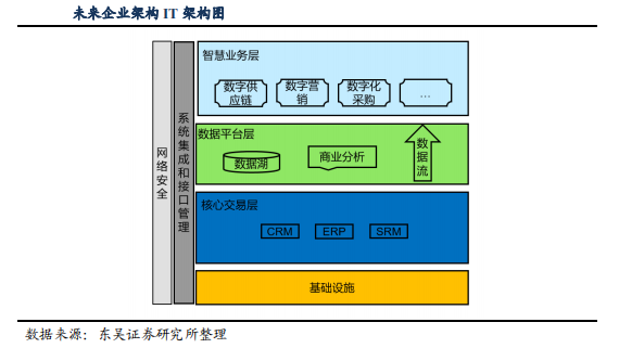 3. 数据平台层:云平台,是公司提供的企业级云应用的“底座”,亦即 PaaS 平台,它是企业云服务的开发框架,也是在云上集成核心系统和各类 SaaS 服务(以及SaaS 的外部定制)的集成平台,还包含了人工智能、物联网、区块链等服务。