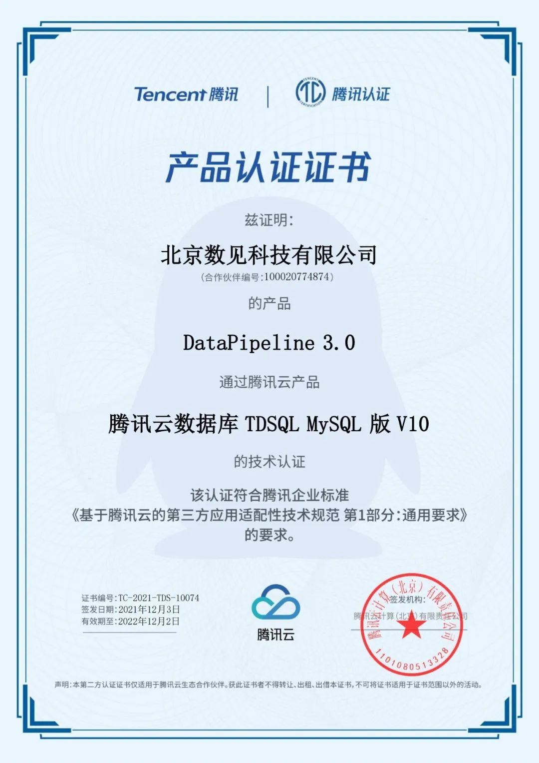 近日,DataPipeline与腾讯云数据库TDSQL顺利完成产品兼容性互认证。双方联合测试结果表明:DataPipeline实时数据融合平台与腾讯云数据库TDSQL兼容良好,性能卓越,系统运行稳定,可顺利部署并对外提供服务。未来,DataPipeline将持续建设共赢生态,为银行、保险、证券、电信、能源等各行业提供安全可信的实时数据管理产品,助力各企业组织的数智化转型。