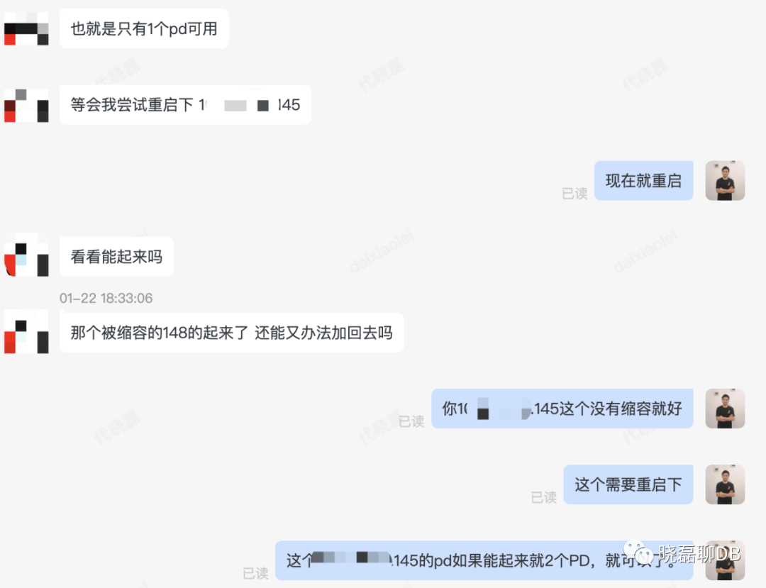 3、整个集群宕机已经有一段时间,小伙伴可能有些慌乱,并且中间尝试集群restart、--force下线PD、扩容PD等操作,具体细节以及顺序已经忘却。