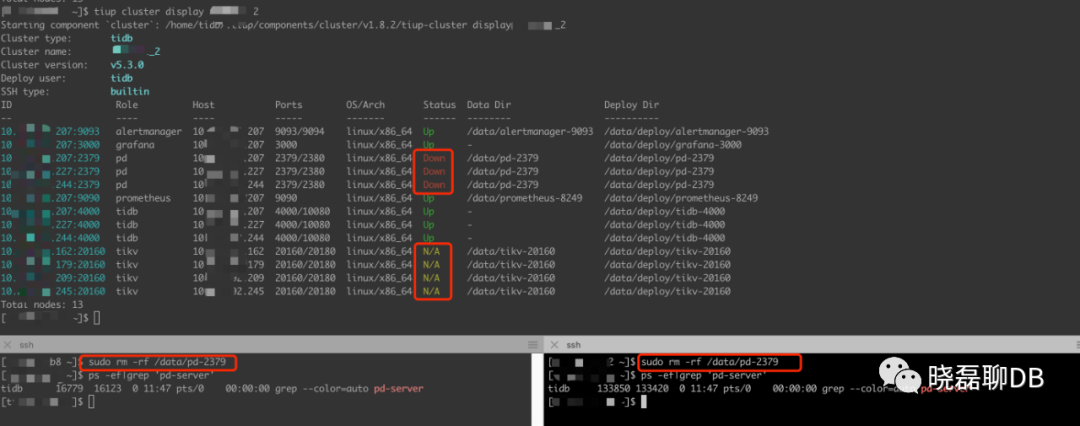 这一步是删除旧的数据目录,现在所有PD集群节点都已经down,并且数据目录都已经被我删除。