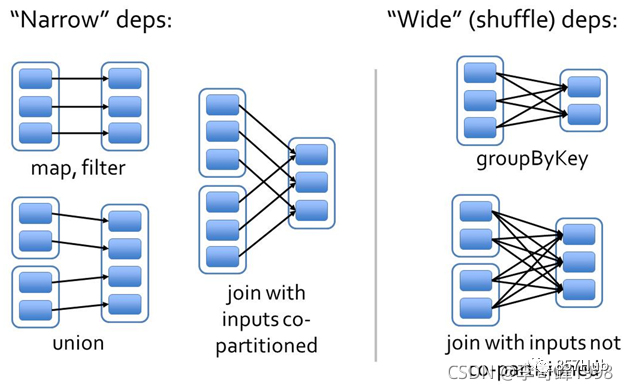窄依赖是指父RDD的每个分区只被子RDD的一个分区所使用,子RDD分区通常对应常数个父RDD分区(O(1),与数据规模无关)