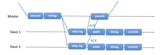 是介于全同步复制与全异步复制之间的一种复制方式。当执行完一个事务后,主库需要等待至少一个从库节点收到日志事件并刷新Binlog 到 Relay Log 文件中的ACK确认消息后,才能提交并返回给客户端确认信息,主库一般不需要等待所有从库的ACK。这里需要说明返回的确认信息是确保日志传送到备库并写入到中继日志(备库还需要通过sql线程重放后才真正将数据写入到备库),而不是在备库已经完全完成并且提交、已将真正数据写入。理论上只要日志传送到备库并写入到中继日志,那么就可以保证数据一致性,只是会有一定的延迟。