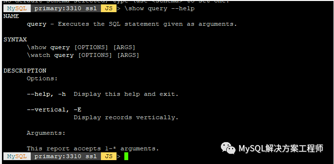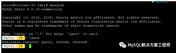 MySQL Shell附带3个“报告”,即'query', 'thread', 'threads'。