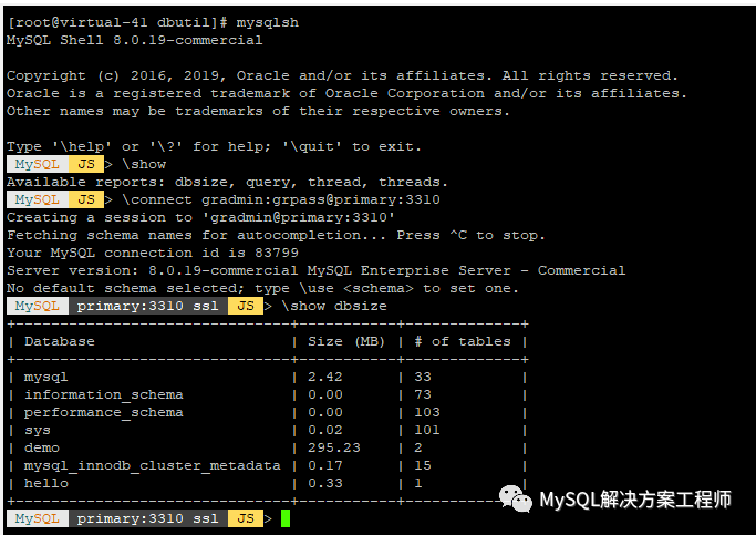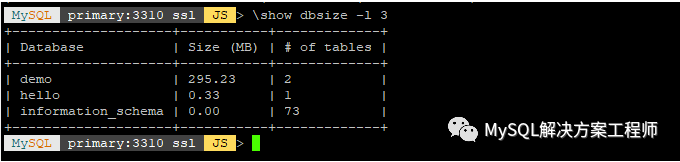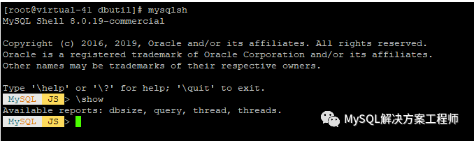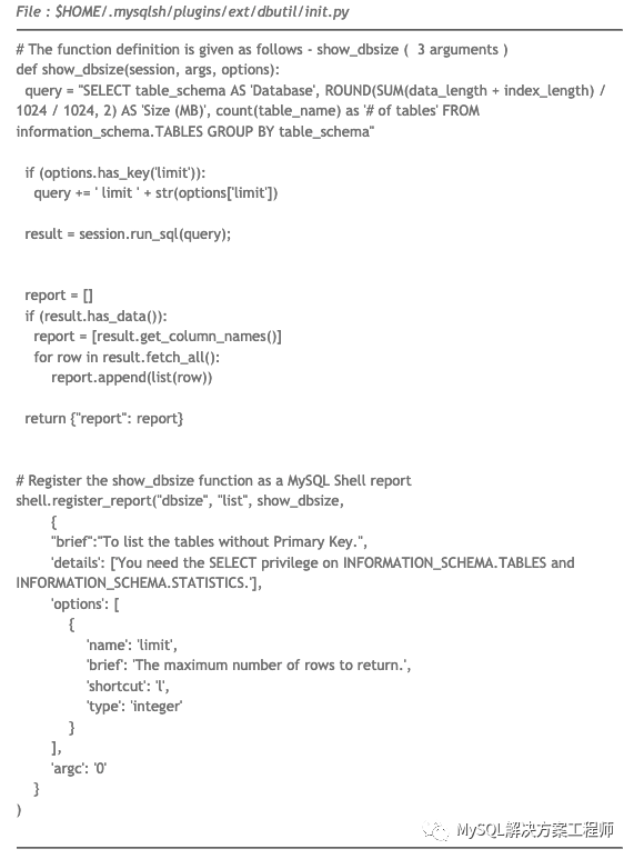 在$ HOME / .mysqlsh / plugins / ext / dbutil / init.py下创建文件后,MySQL Shell将查找新报告,而“ \ show”将显示添加的“ dbsize”报告。