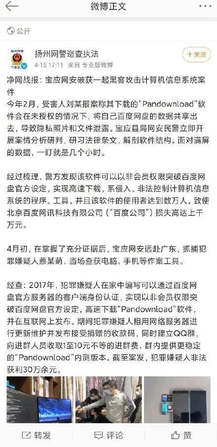 昨天下午,根据@扬州网警巡查执法 官微通报,宝应网安破获一起黑客攻击计算机系统案件。
