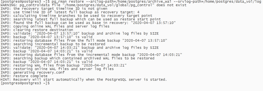 --使用pg_rman进行恢复,注意如果归档目录不存在,则需要手动创建一个归档目录