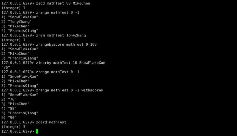 zrange key start end [withscores] 获取指定索引范围的元素加上withscores则返回分数 O(logn + m) 时间复杂度
