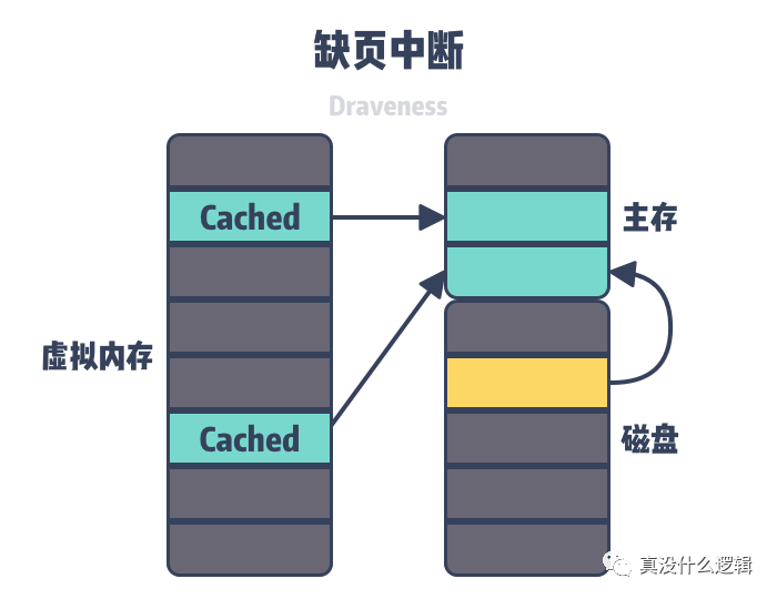 我们可以将虚拟内存看作是在磁盘上一片空间,当这片空间中的一部分访问比较频繁时,该部分数据会以页为单位被缓存到主存中以加速 CPU 访问数据的性能,虚拟内存利用空间较大的磁盘存储作为『内存』并使用主存储缓存进行加速,让上层认为操作系统的内存很大而且很快,然而区域很大的磁盘并不快,而很快的内存也并不大。