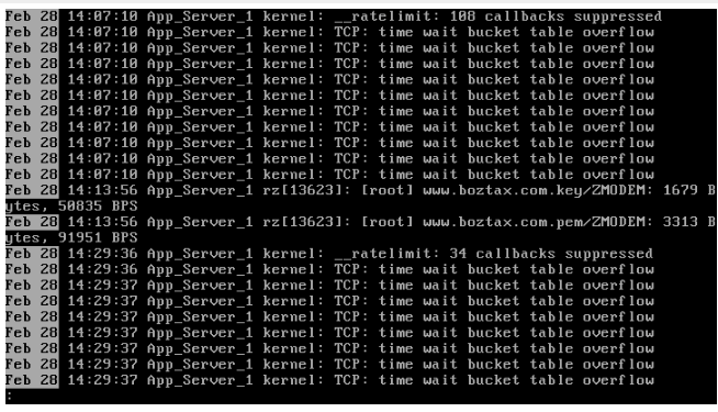 2)统计tcp连接,几百。先不用着重考虑攻击了。用tail -n 1200 /var/log/messages查看内核日志,是TCP TIME WAIT的错误。可以理解为CPU使用100%,程序无响应外面的tcp请求超时。这是结果,还是没有找到根本原因。