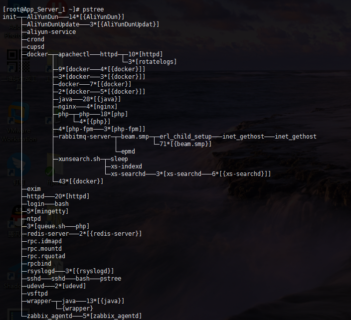 3)用pstree查看打开进程,ps aux|wc-l看看有没有特别多的进程。虽然zabbix监控上说没有,但是我们要检查一下看看有没有异常的进程名字。