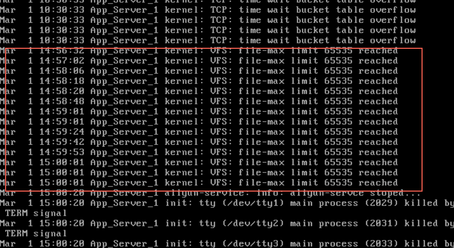 接着往下看系统内核日志,发现了和“open too many files”呼应的错误,“file-max limit 65535 reached”意思是,已到达了文件限制瓶颈。这里保持怀疑,继续收集其他信息。