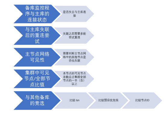 备库端的监控程序在判断切换的指标中应当包含下列维度,只有全部维度的检查条件都满足才可以进行备->主的切换操作。