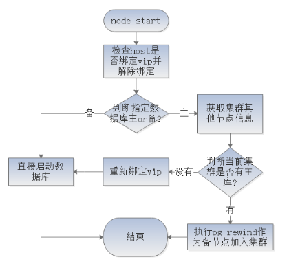当主库停库或者断电之后进行数据库重启的操作时,需要根据当前集群其他节点的状态决定采取什么样的启动操作。比如当集群中已经有新promote的主节点时,原主节点的数据库不可直接采取强制启动操作(使用pg_ctl),而应执行一系列检查逻辑。否则极容易在人工启动数据库或者系统自启动时形成脑裂。针对此点,高可用可以提供封装好的数据库节点启动接口。下面是一套可行的节点启动逻辑,可以帮助数据库维护人员在节点维护时实施傻瓜式节点启动操作,也可以作为操作系统开机启动数据库的启动服务脚本运行,通过这种封装后的命令作为统一的启动接口,可以有效避免启库瞬间造成的脑裂状态。