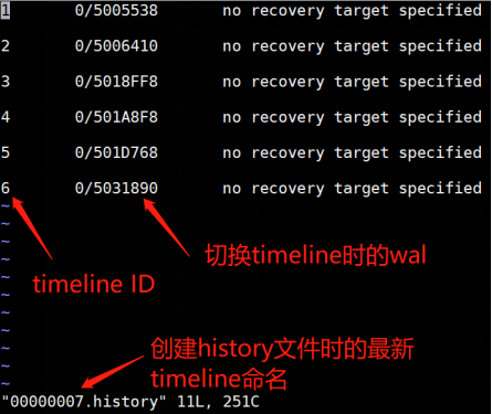 另外每次新启timeline都会生成一个timeline.history文件(如下图)。该文件中会记录每个timeline起始时的wal地址,以及timeline切换的说明,在选择基于时间线的恢复时,可以指定恢复到的时间线。