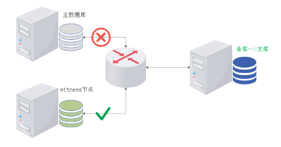 在此场景下,若备库端高可用监控简单依据与主库的失联即实施切换操作,显然不合理,极容易导致脑裂现象。可行的方案是在集群中设置witness节点作为辅助观察点,在备库观察到与主库失联时,可同时查看witness节点的可见性,若witness可见则实施切换。