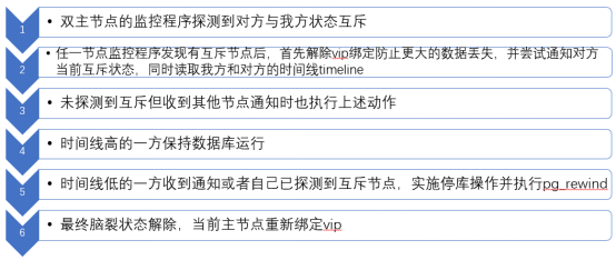 对于监控程序探测到脑裂的自动修正,其基本逻辑类似于1.2节中提到的人工修复脑裂状态,即将脑裂的判断与处理步骤自动化,省去人工检查和判断。但需要注意的是这种恢复行为由于是从两条PG时间线中挑选一条恢复,舍弃的时间线上的部分数据将被忽视。